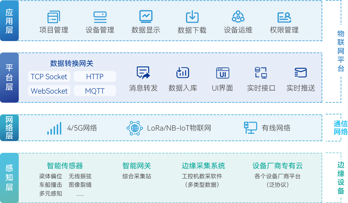 是一种智能嵌入式网络设备,可以采集各类传感器数据,利用自定义接口协议进行数据转换,并将数据接入云平台。它具有协议转换、数据整合与传输、本地处理与存储、自主控制、边缘计算等功能。单台设备集成8个......江苏科运智慧倾力打造的一站式AIoT管理平台, 实现物联网设备的全面感知、全域互联、全程监控,以及云、边、端一体化管理。 不仅能向下兼容并接入各种传感器、终端和网关,处理各种不同通信协议,还能向上快速集成融合数据,提供设备管理、数据存储、数据显示、数据下载等全方位服务,并为第三方应用提供标准的API数据接口。 通过AIoT平台的建立,基于客户需求提供一站式的智能化解决方案,为客户提供软件开发、维护及其他相关服务,并配套提供智能硬件设备,打造从连接层到业务层一站式技术服务, 赋能产品研发到项目落地全链路。